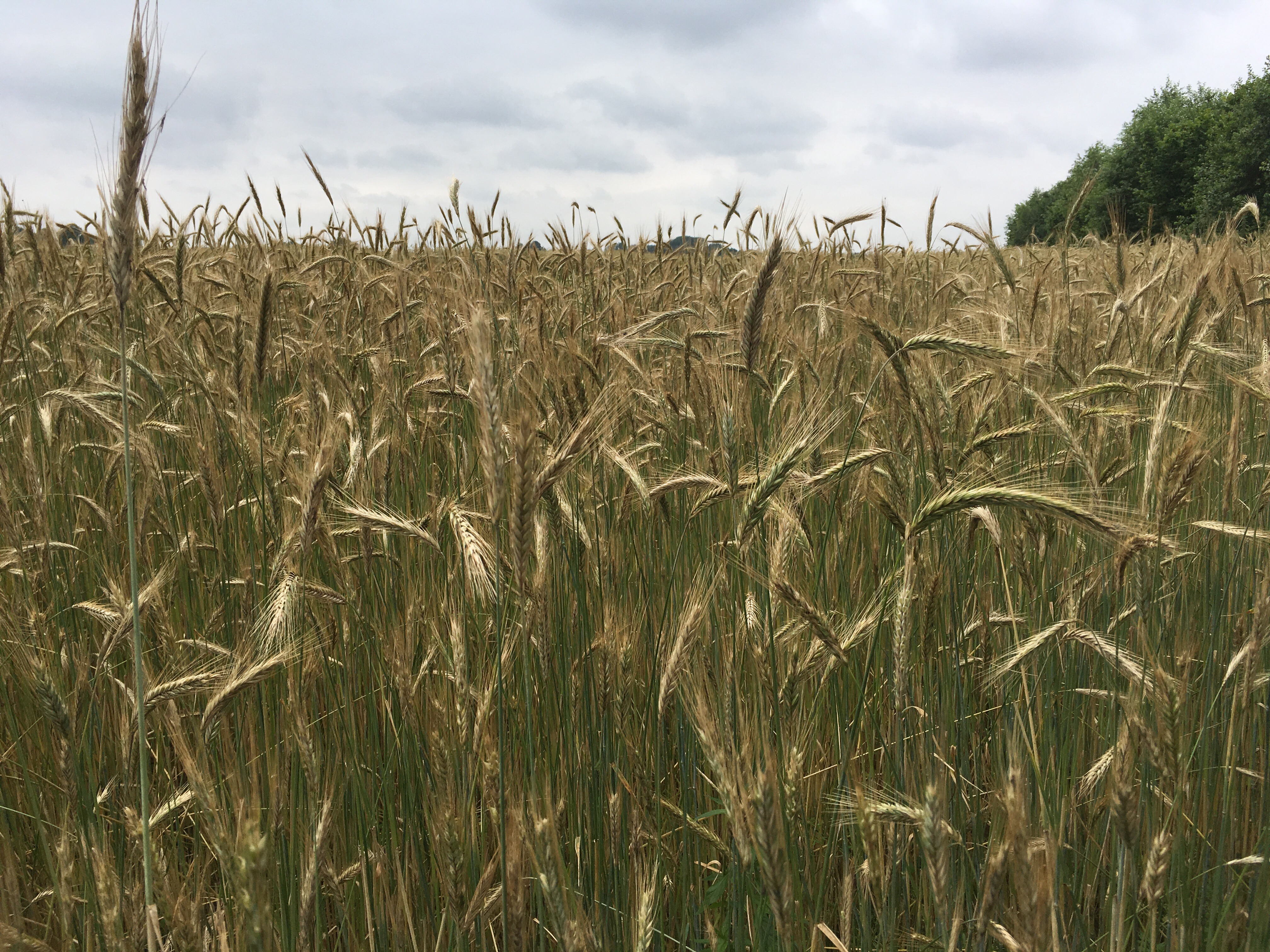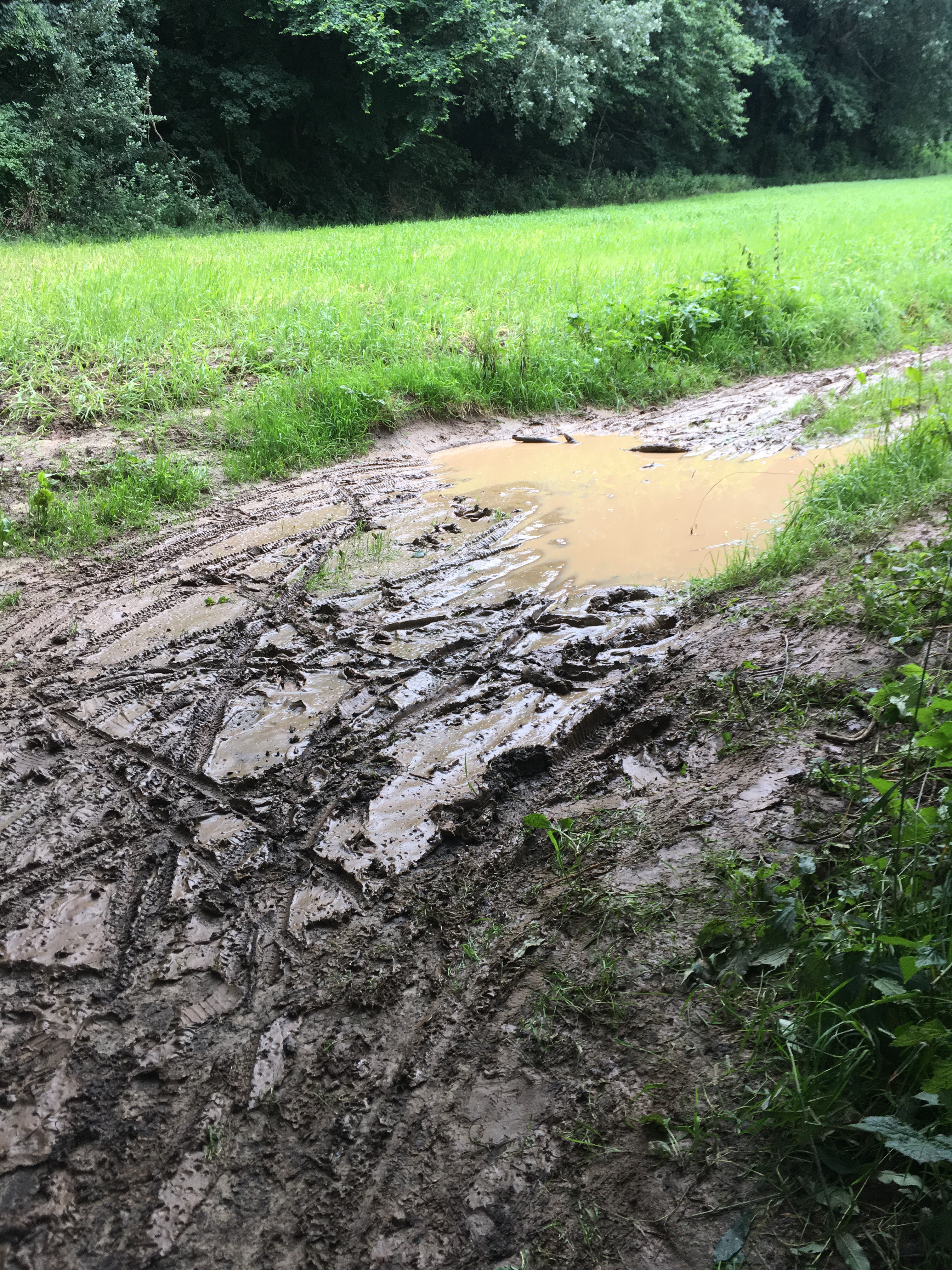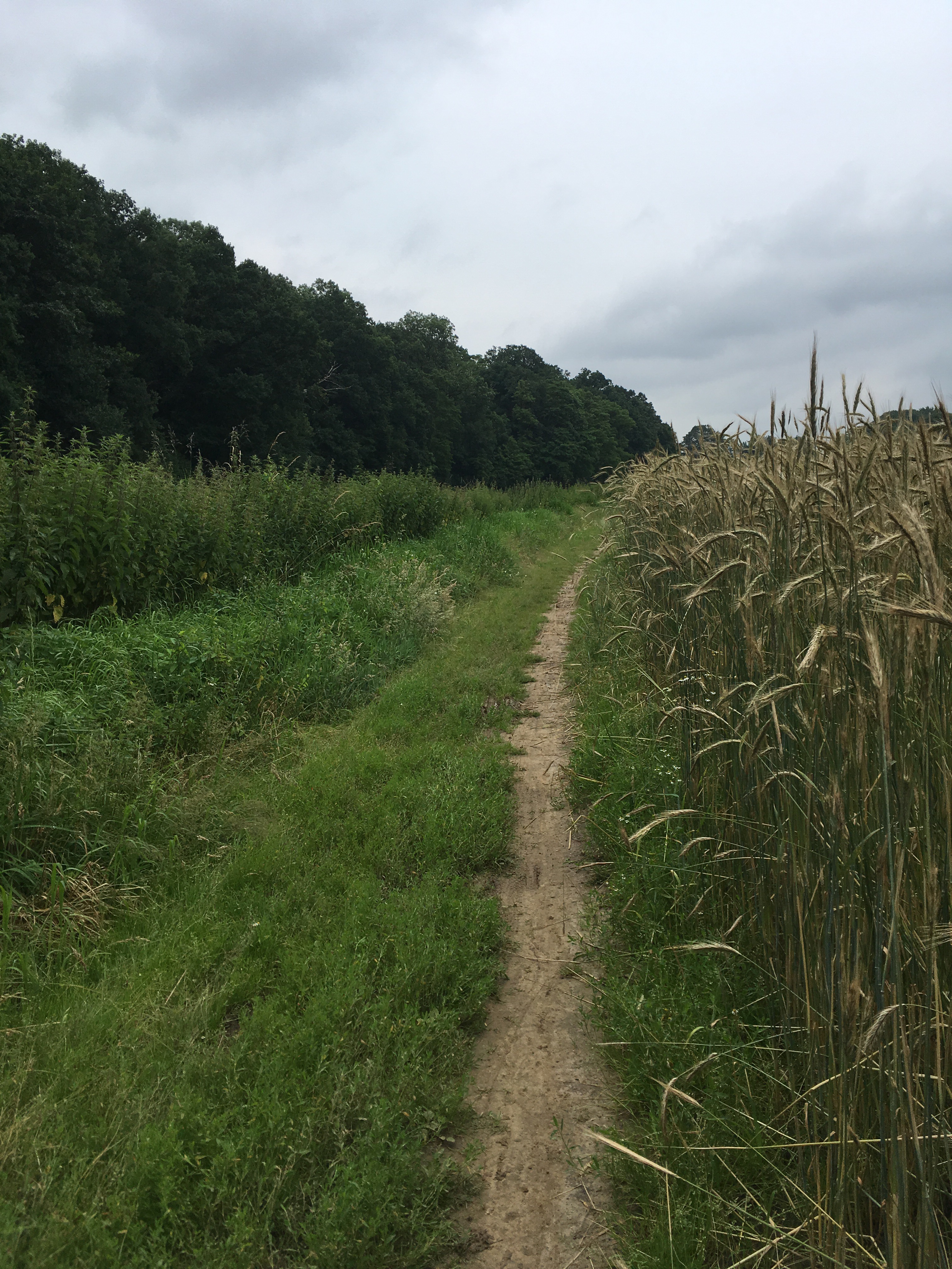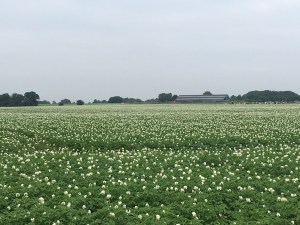 And now for today’s adventure. We decided to bike into Sittard to get some things at the Markt. Dick mapped out a route on Google that paralleled the main road and would take us through some fields. Sounded great. The first leg was through a picturesque small town and past a castle that’s now a hotel/restaurant. Lovely! We then turned off onto a ‘bike path’. So, it did look like a bike path at first since it was wide and paved, but then it became gravel . . . and it narrowed . . . and it got muddy. The path then narrowed into what us country folks call a COW PATH. City bikes do not belong on cow paths! Did I mention that we’ve had a lot of rain? This was a MUDDY cow path. We had to dismount the bikes and carefully walk around the mud. Oh and I was wearing flats — not ideal footwear for this journey. A couple of mountain bikers passed us, gleefully riding through the mud. I imagine these guys had quite a laugh over beers later as they recounted the sight of ridiculous Americans sloggying city bikes through the fields. 😛 It WAS ridiculous, but it was also amazing. That muddy cow path led us through fields of corn, barley, wheat and potato fields in full bloom. What a beautiful sight!