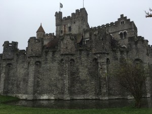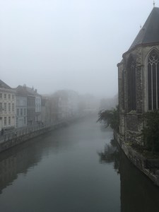 Gent (Ghent) is another medieval city just 30 min. from Brugge. We drove there through the fog on Sunday morning. The fog didn’t clear until mid-afternoon and the temperature hovered around 40 degrees all day. It was kind of fun seeing this old city in the fog at first, but we were wishing for sun by noon.