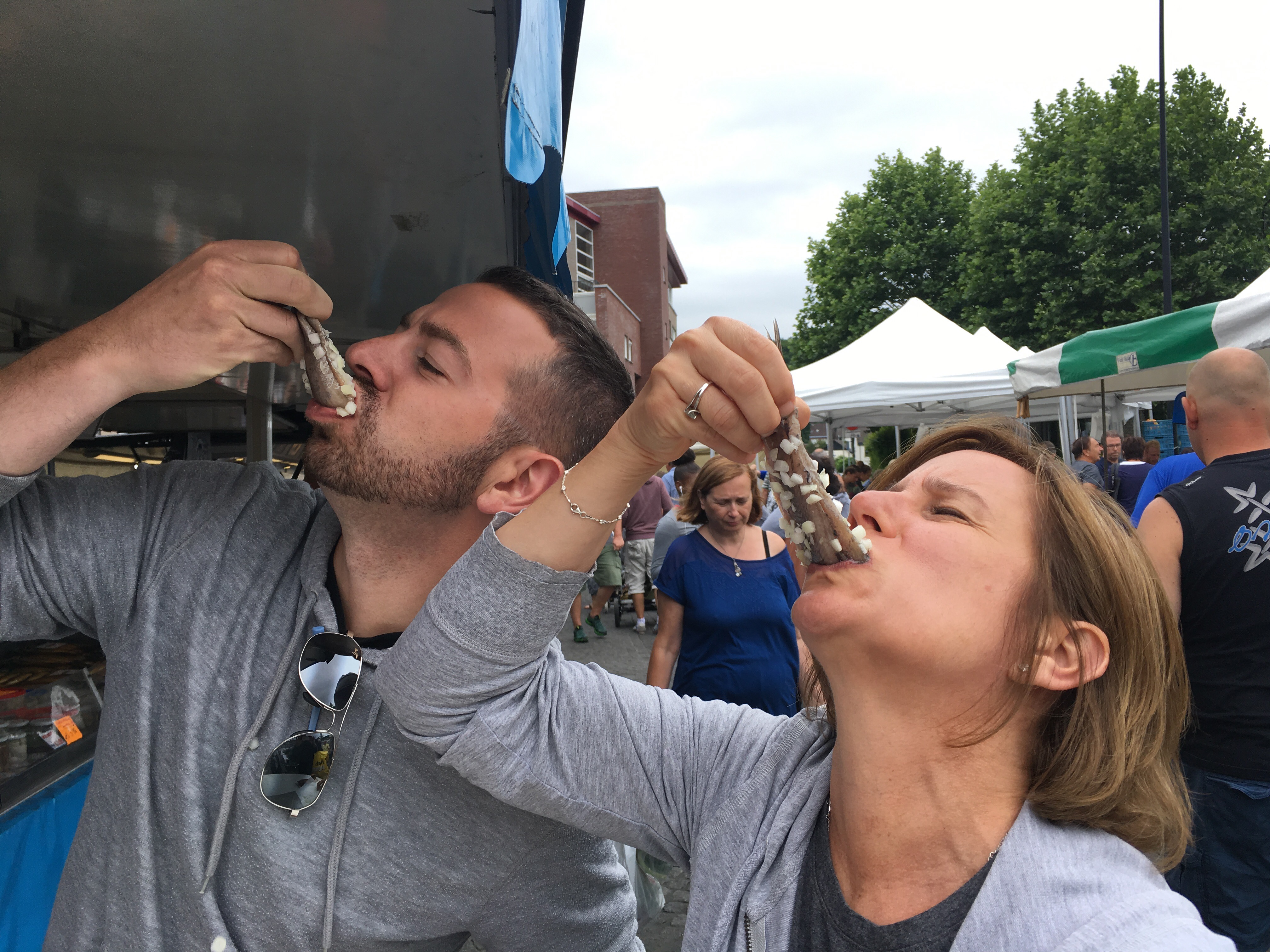 We started the day with a European breakfast, which is more like a brunch. After a little walk up to the windmill, we drove to Brunssum to see what can be seen of JFCBS from the gate and then to the big market in Eygelsoven. We had a German version of apple pancakes and Matt was brave enough to try herring (niewe haring) with me. We also stocked up on fruit and veggies. After a short nap back at the house, we biked to Hoensbroek Castle. We had to take a zigzag route because of construction and a carnival in the center of town. My co-worker Ioana joined us for dinner later and we went into town for the annual Oirsbeek music festival — Har Rock Cafe (that’s not a typo :-)). So we listened to one band and that was enough. 😀