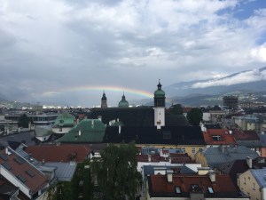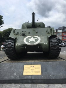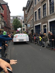 Dick got very excited when he learned that this year’s Tour de France was starting in Düsseldorf and the route of the second stage was through Aachen, just 28 km away. He has watched the tour on TV for years and the chance to see even a glimpse of it in person was irresistible! We made plans to take the bus into Aachen (to avoid traffic closures) and find a spot near the main square to see the riders. We ended up just off the square where we had a good view on the street after a sharp turn. After about a hour of waiting, the mood became festive as the sponsors paraded through, honking horns, blaring music and throwing out swag and free samples. Shortly after that, the team’s lead cars came through. It started to rain about then and we knew it was going to be a wet view of the riders. Even with the rain, sharp turn and slight uphill, they were fast! I’m glad I caught it on video so we could relive the moment. When we watched the stage later on TV, there was no footage of the Aachen stretch.