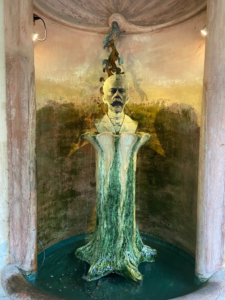 Today’s curious siting: a teeming koi pond and creepy sculpture in a little tucked-in park.