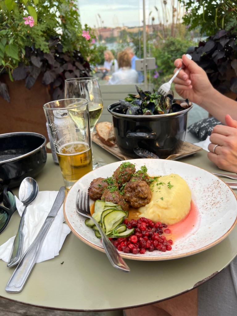 Our belated anniversary dinner was at a restaurant with floating pavilions. I had marinated mussels — Moules! — and they were delicious! Dick went for the iconic Swedish Meatballs.