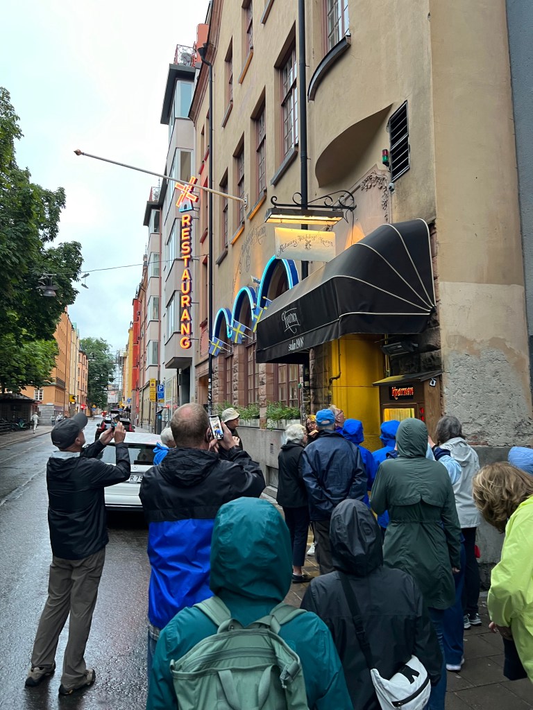 The rain started as we were eating a late lunch and it lasted the rest of the day. We met our tour group at 4:00 and got acquainted. I guess it’s not surprising that everyone but us is retired (or maybe just doesn’t work?). Our tour guide took us around the area of our hotel and then we took a bus to a restaurant off the beaten path where we had an authentic Swedish meal. It consisted of pickled herring, cheese, Swedish meatballs, potatoes and lingonberries. It was delicious!
