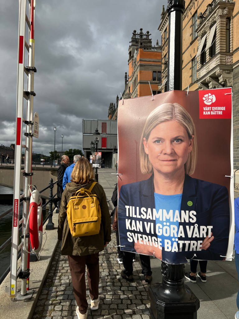 Curious siting: a parliamentary election is coming up soon in Sweden and there are political posters everywhere. This one is for the current Prime Minister. We walked by her residence and right in front is a line of posters for her opponent – kinda in your face!