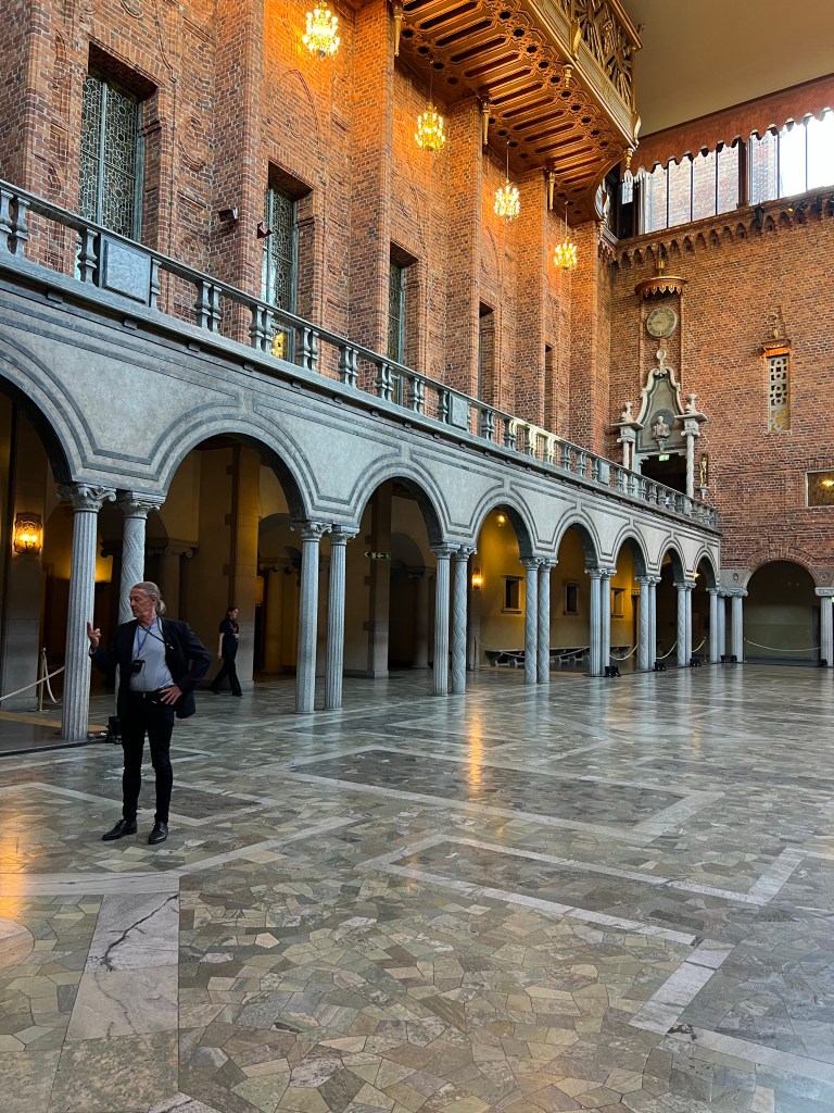 We were on the move by bus today after a fascinating tour of the Stockholm City Hall. This is where the Nobel Prizes are awarded. We saw the hall where the dinner is held and the Gold Hall where the dancing happens afterwards. The entire interior is very impressive.